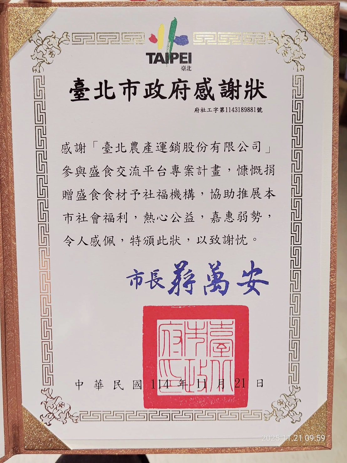 臺北農產運銷公司長期投入公益不遺餘力,多年來持續支持臺北市政府推動的「盛食交流平台」專案計畫,穩定提供新鮮蔬果予社福團體。今(21)日,北農總經理吳芳銘出席臺北市政府社會局「多元餐食共識營」活動時,獲市府頒發感謝狀,肯定北農在推動社會福利與減少食材浪費上的努力與貢獻。