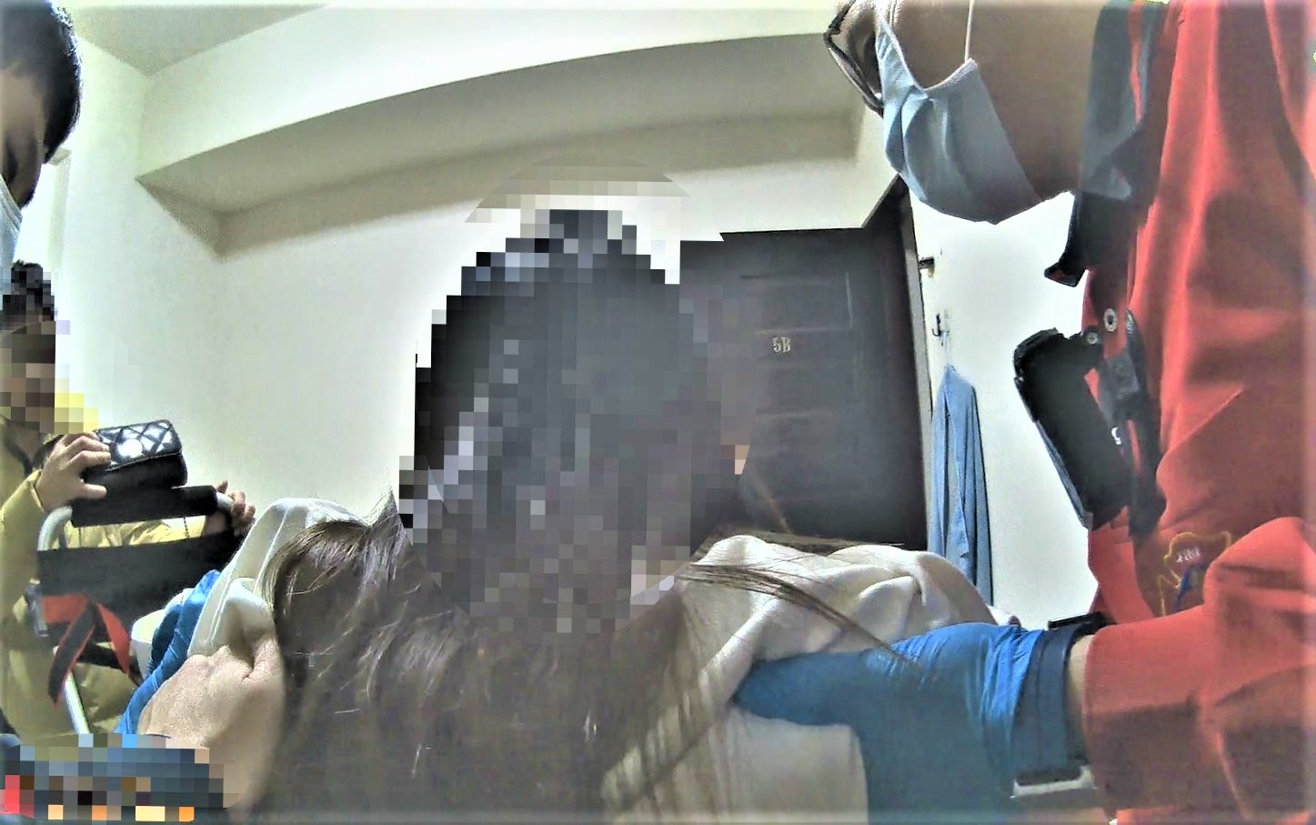 員警敲門均未有人回應,發現房門未上鎖,經盧男從細微縫隙呼喊請開門,發現吳女躺在床上無法起身,驚覺事態嚴重,經同意陪同進入並立即通報救護人員前來,經初步檢視診斷,發現吳女疑似已有服用藥物意識不清楚必須立即送醫。協助救護人員合力將吳女攙扶下樓至救護車送醫救治,其他同事陸續到場關懷並跟隨前往醫院,並向警消人員表示感謝之意,所幸員警及救護人員及時救護,才能避免憾事意外發生,臨行時頻頻道謝,感謝員警有效率且積極的協助,才能找到吳女並能順利送醫救治。