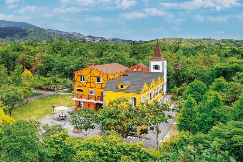 建築靈感源自南德巴伐利亞風格,融合法、德、奧經典木桁式設計。白牆、尖塔與拱型廊道錯落有致,層次分明。無論是晨霧中映照的白牆木窗,或夜色下點亮的暖黃燈光,都營造出宛如置身歐洲鄉村的愜意氛圍,讓旅人不出國門,也能享受異國風情。