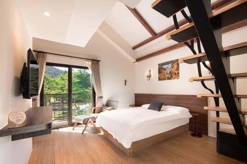客房設計延續歐風主題,房名皆取自歐洲最美小鎮,花園雙人房正對落雨松林及花園景觀,四季風景如畫;閣樓三人房以斜頂木樑設計搭配私人陽台,打造溫馨居家氛圍;山景四人房可遠眺中央山脈,白日望山、夜裡觀星。每間房都以「安靜、自然、舒適」為核心,將生活美學細膩融入住宿體驗。