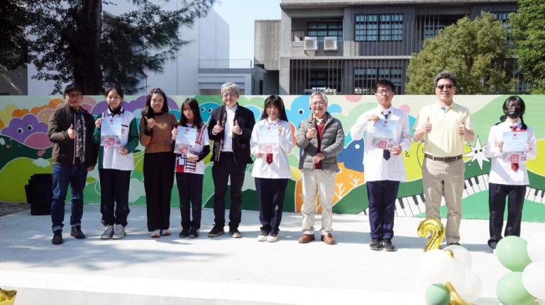 彰化藝術高中公共藝術彩繪牆23日正式落成揭幕,活動中心外牆全新公共藝術作品亮相,為校園與八卦山城注入嶄新藝術風貌。這次彩繪牆以牆面為核心媒材,由彰化藝術高中師生攜手藝術家簡源忠、楊金純共同創作,亦是學校校訂課程主軸「在地記憶、藝術創生」的重要實作成果,展現藝術教育走出教室、回應地方的具體行動。