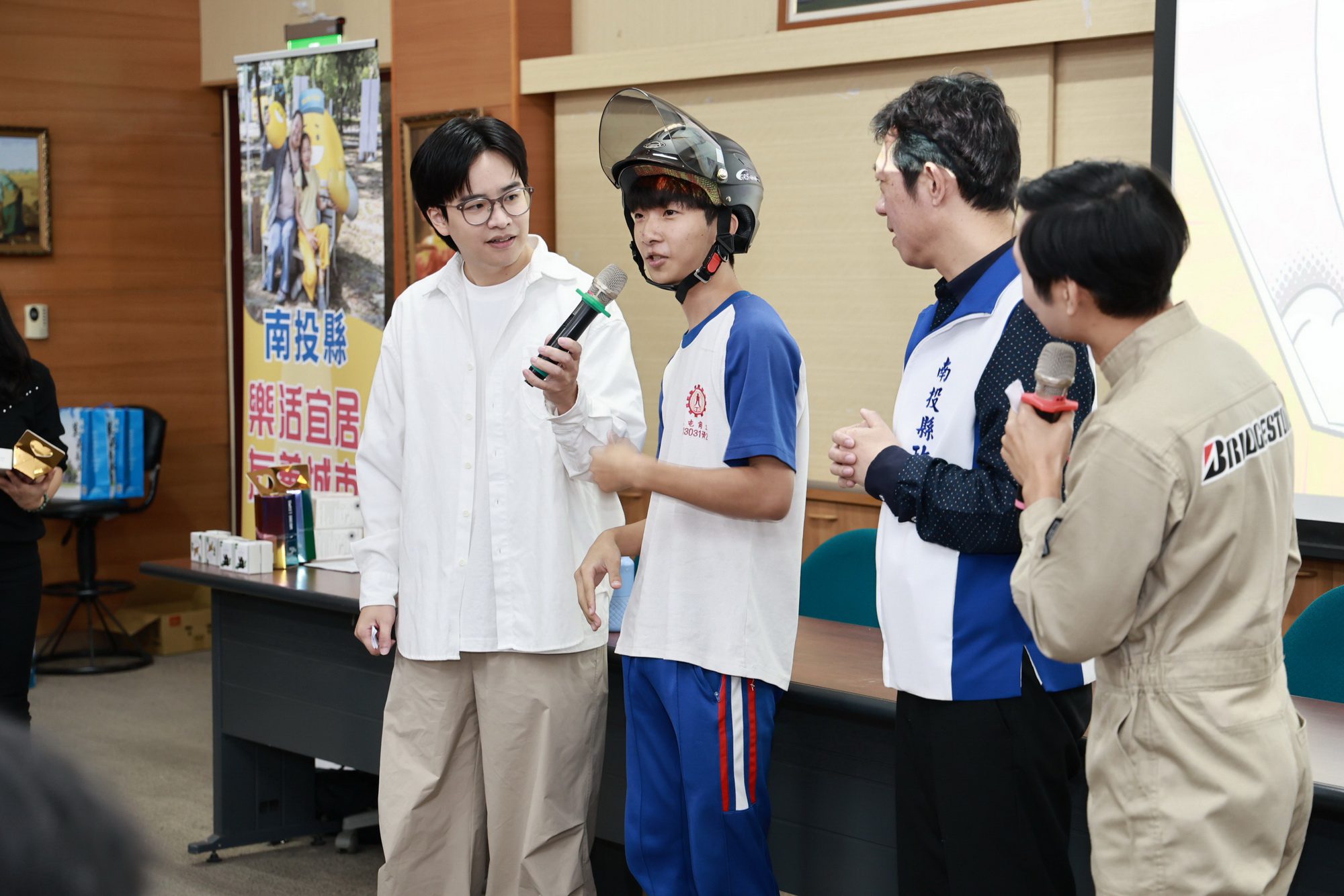 南投縣政府為提高政令宣導效益,陸續前進縣內4所高中職校園辦理道安、食安、防詐騙等宣導活動,邀請到知名藝人黃逸祥及歌手鄭可強搭檔演出,以逗趣演唱等寓教於樂的方式,導引學生加強認知,縣府新聞及行政處長蔡明志3日下午前往草屯商工與學生們互動,透過宣講及有獎徵答方式,讓學生留下深刻印象。