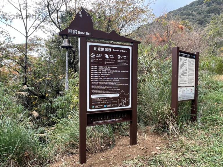 注意熊出沒告示牌外觀以大霸尖山意象為視覺主軸,並掛置大型熊鈴,兼具強化警示及保育宣導效果,牌面除介紹臺灣黑熊活動痕跡外,也提醒民眾在山區活動應提高警覺,應妥善收存食物及廚餘,避免吸引黑熊靠近,告示牌下方為熊鈴掛置箱,提供山友借用與歸還,山友在上攀大小霸前可於15k處或19k處取用,下山後歸還原放置箱即可,熊鈴的佩帶可讓山友在行進間製造聲響,以降低遭遇臺灣黑熊的可能性。