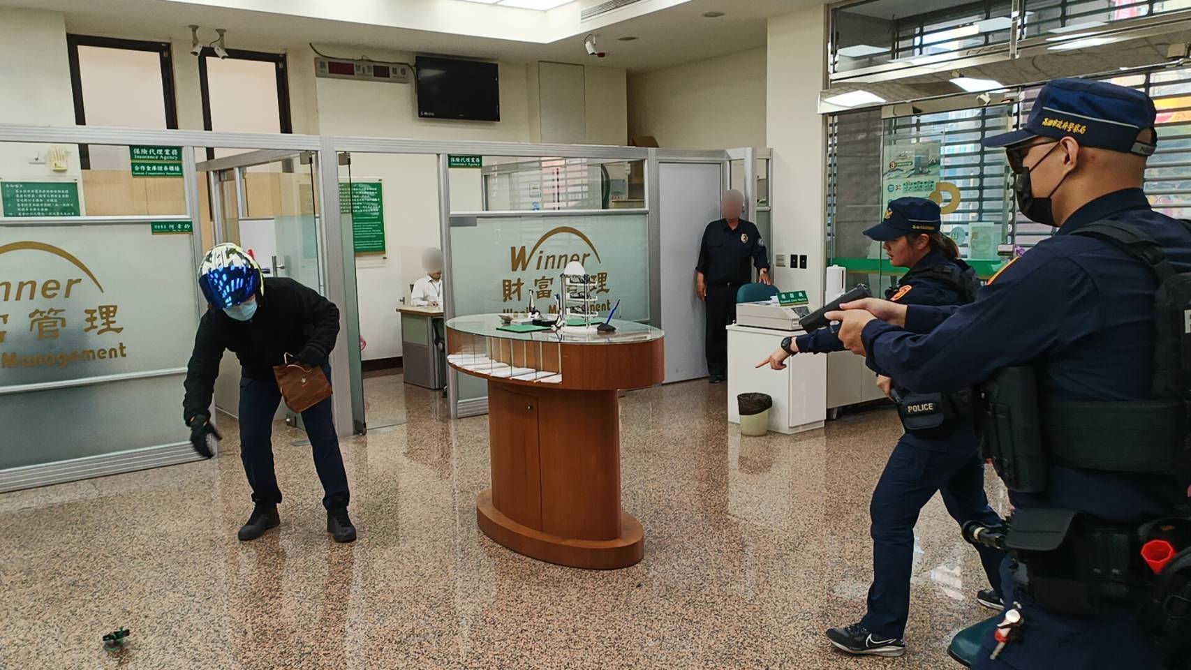 旗山分局建國派出所值班人員接獲警報後,立即啟動「線上快打機制」,迅速派遣巡邏警力趕赴現場。員警抵達時,歹徒正欲離開銀行,隨即遭警方當場攔阻,員警立即依標準程序拔槍示警,喝令歹徒放下武器,歹徒見大勢已去,當場棄械投降,順利遭警方上銬逮捕,演練圓滿完成。