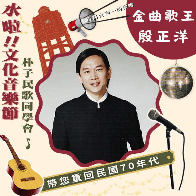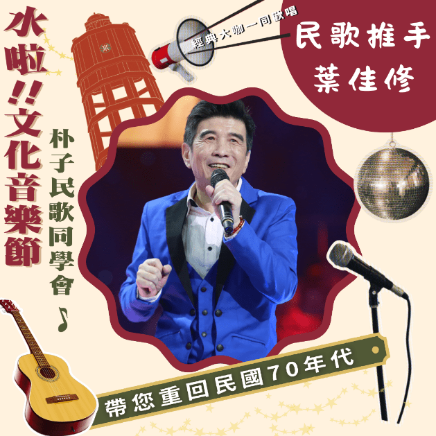 嘉義縣文化觀光局將於11月29、30日在嘉藝點水道頭文創聚落舉辦「水啦!文化音樂節」,以「朴子民歌同學會」為主題,邀請殷正洋、葉佳修、周子寒與陳偉民等民歌時代的重量級歌手齊聚開唱,帶領觀眾穿越時光,重返民國70年代的青春歲月,在熟悉的旋律中感受世代共鳴。