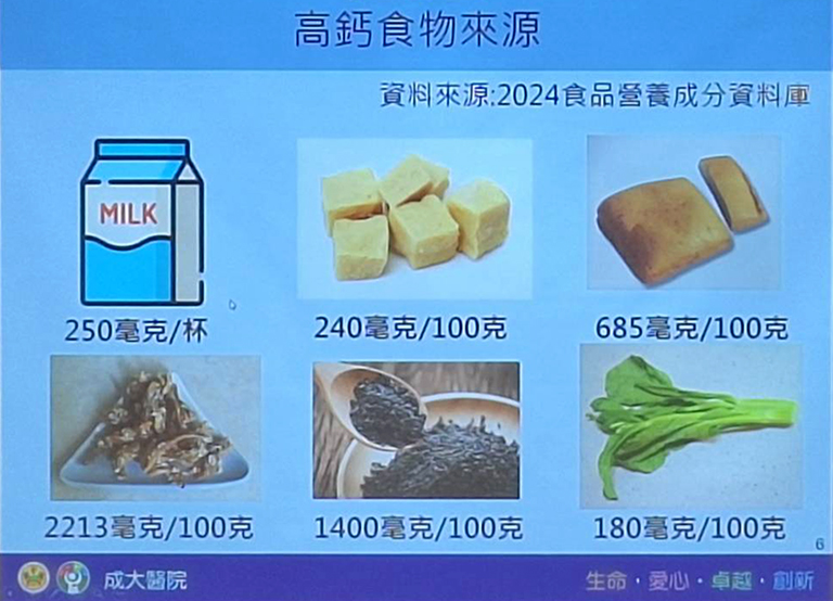 成大醫院營養部黃薇營養師說明,鈣是人體內含量最多的巨量礦物質營養素,99%存在骨骼及牙齒中,幫助維持骨骼強健;剩餘1%分布於軟體組織與體液中,控制肌肉收縮、神經訊息傳導、細胞內訊息傳遞與荷爾蒙分泌等重要功能。