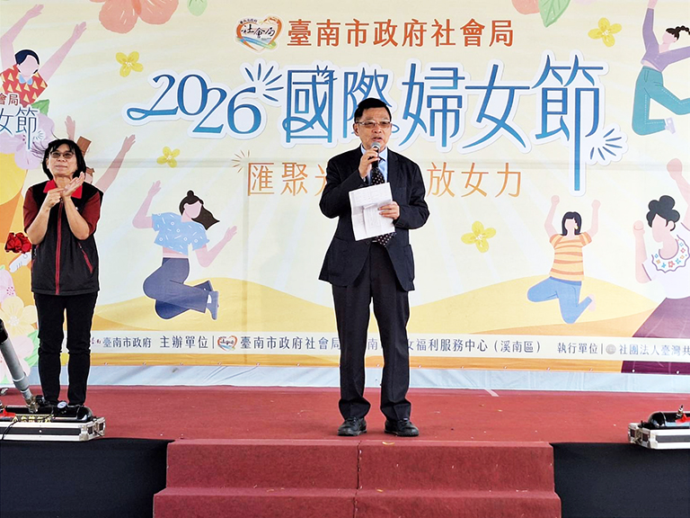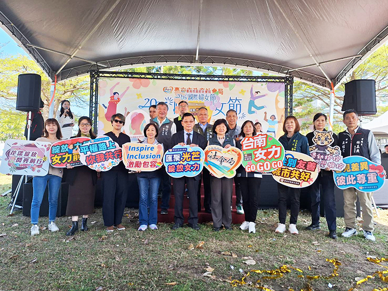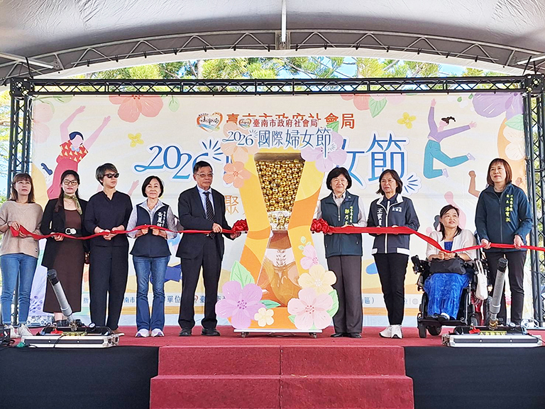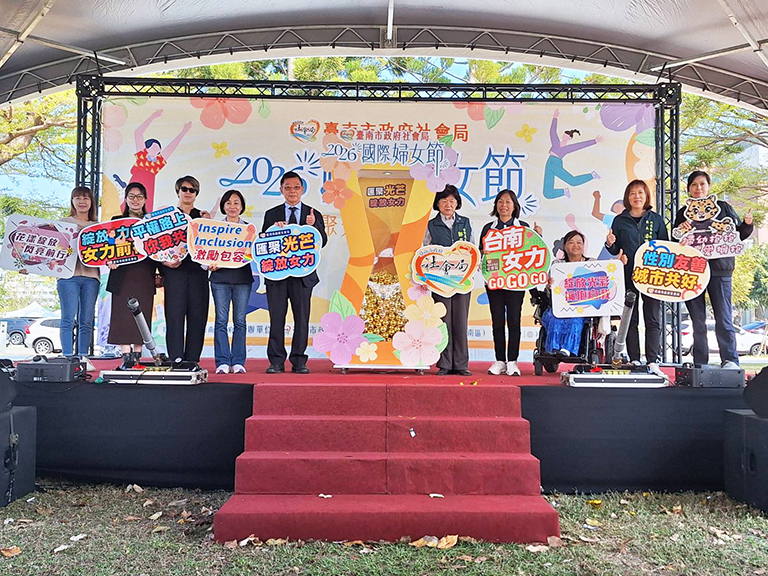 臺南市政府社會局響應2026年國際婦女節,今(8)日在永華市政中心旁西拉雅廣場盛大舉辦「歡慶2026國際婦女節-匯聚光芒,綻放女力」活動。副市長姜淋煌率社會局郭乃文局長及市府團隊各首長共同出席,透過象徵資源連結與支持給予的「金色光球」揭開活動序幕,宣示市府將持續攜手社會各界,成為女性堅實的後盾,綻放女性多元發展與無限可能。陳亭妃立委、林俊憲立委、王家貞議員本人、黃麗昭議員本人、李啟維議員本人、沈震東議員本人、邱莉莉議長、郭信良議員、林美燕議員及陳怡珍議員等服務處均派員出席,另有性別平等及婦女權益促進委員會徐珊惠委員、邱麗夙委員、許玉靜委員、童氏容委員及婦女團體代表們共同響應盛會。