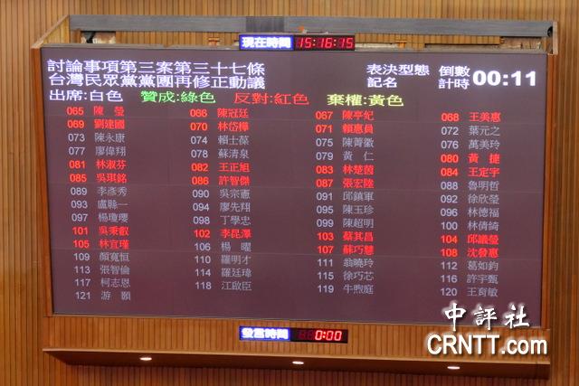 隨後表決國民黨團再修正動議,這次換民眾黨立委未投票,最終票數贊成52位、反對50位,贊成者多數,因此按照國民黨團所提再修正動議通過。