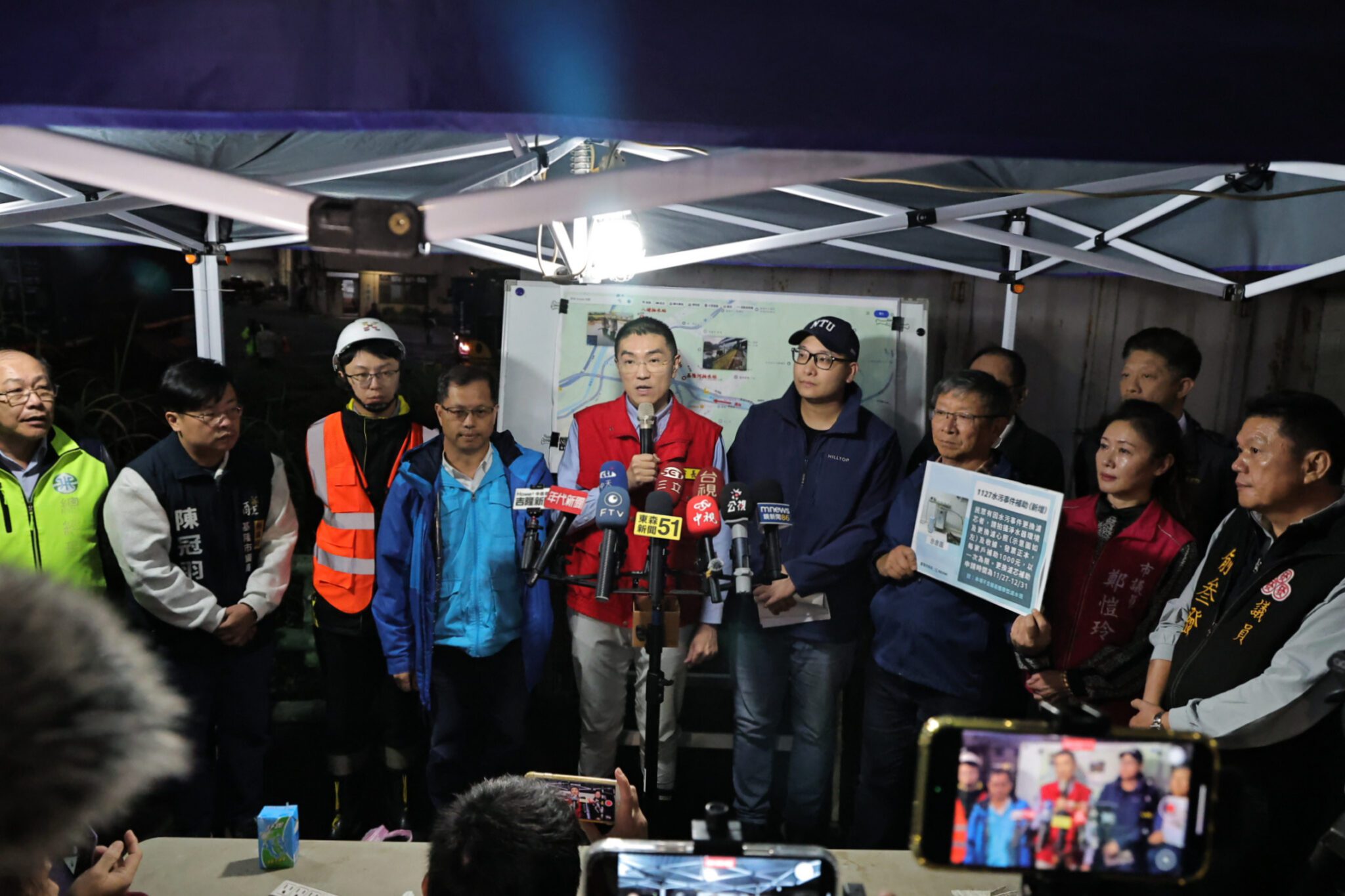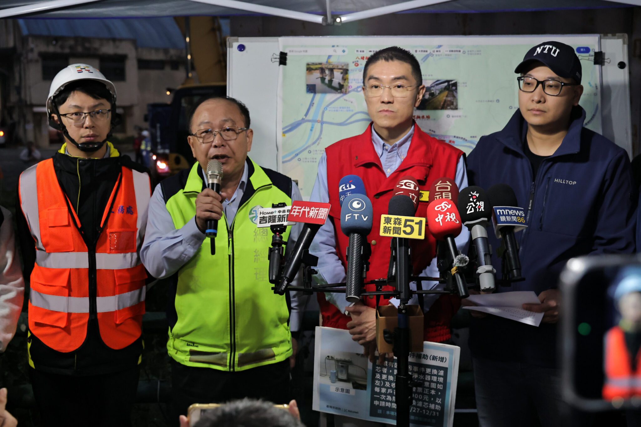 基隆市長謝國樑今(3)日晚間再次前往碇內前進指揮所現場,與自來水公司總經理李丁來、環境部簡任技正簡良達及市府相關單位共同勘查污染整治進度,並宣布因應自來水污染事件,市府補助項目將新增「濾芯更換費用」,協助受影響市民降低生活負擔。