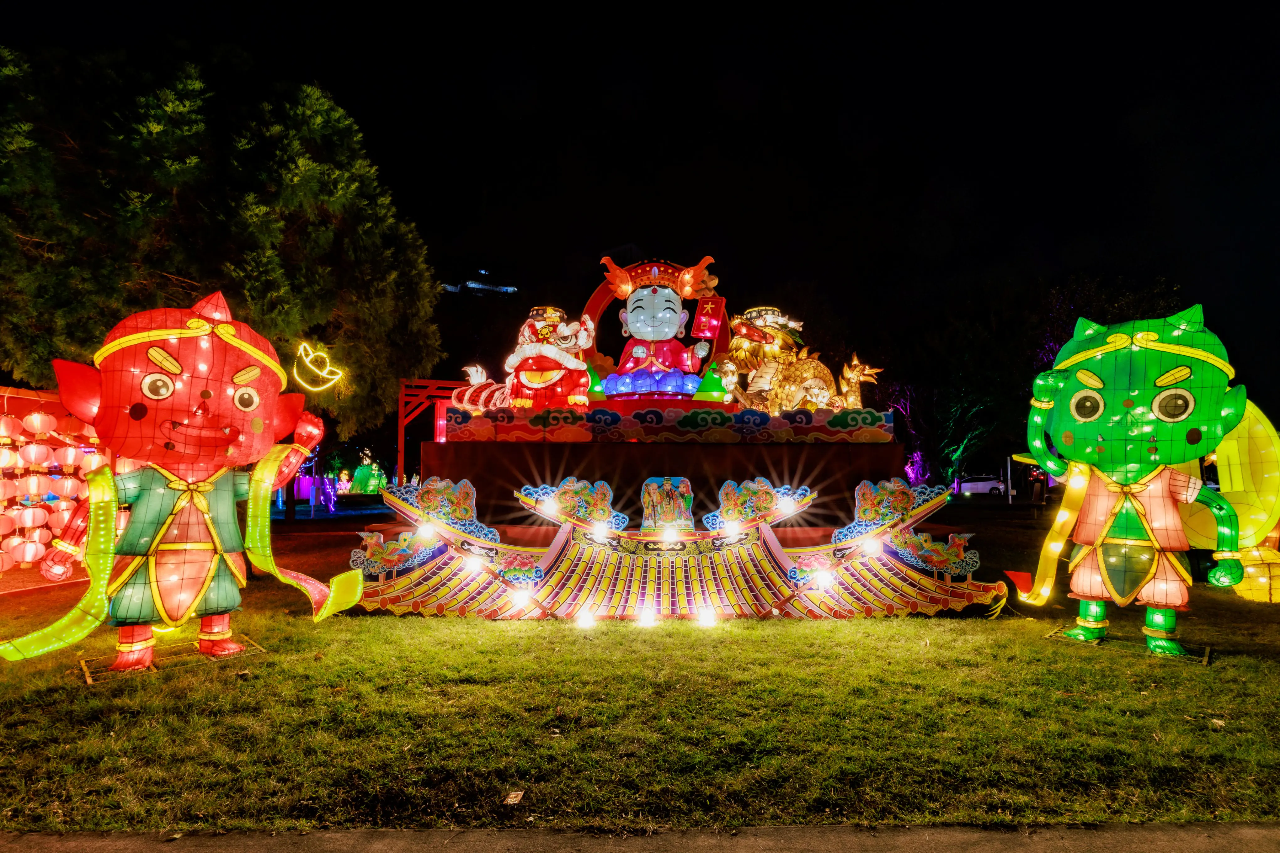 屯區祈福燈組「忠義護鄉土」以大里七將軍廟為靈感,打造氣勢十足的七將軍爺燈組,展現忠義守護地方的精神意涵,並特別設計互動驚喜,民眾只要靠近義犬裝置,即會聽到可愛的「汪汪」聲響,讓賞燈過程充滿趣味與溫度;城區則攜手南屯萬和宮打造「龍馬呈祥慶元宵」祈福燈組,以龍馬神獸為主視覺,象徵太平盛世,祈願城市安樂。四大燈組透過創新燈藝詮釋傳統信仰,不僅展現台中深厚的人文底蘊,也讓燈會成為跨世代、跨文化的城市交流平台,為新的一年注入幸福與希望。