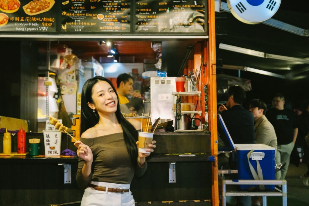 夜幕降臨,大稻埕碼頭的氣味開始變得立體。市集攤位散發出的食物香氣,伴隨人群流動帶來的溫度,以及河岸吹拂的微風,共同堆疊出屬於城市夜晚的「煙火氣」。彩色貨櫃在燈串映照下依序展開,旅人或站或坐,邊品嚐、邊交談,光影在臉龐與餐點表面緩緩流動,讓畫面自然呈現出貼近生活、帶著手作溫度的市集景象。