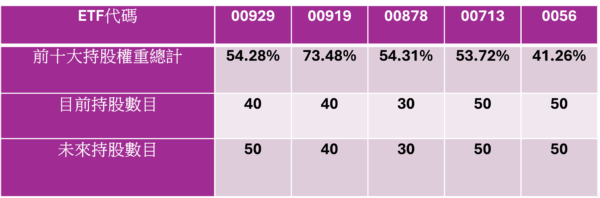 規模前五大高股息ETF,前十大持股權重,00929規則調整後,前十大集中度有機會降至5成以下:
