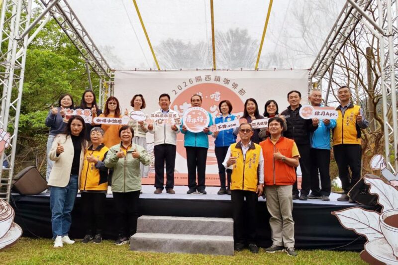 ▲2026「啡嚐.情非得已」關西鎮咖啡節重磅開幕。新竹縣副縣長徐元棟(第2排左6)、竹縣府農業處長傅琦媺(第2排右6)、關西鎮長陳光彩(第2排左5)和與會貴賓們一同於啟動儀式合影。