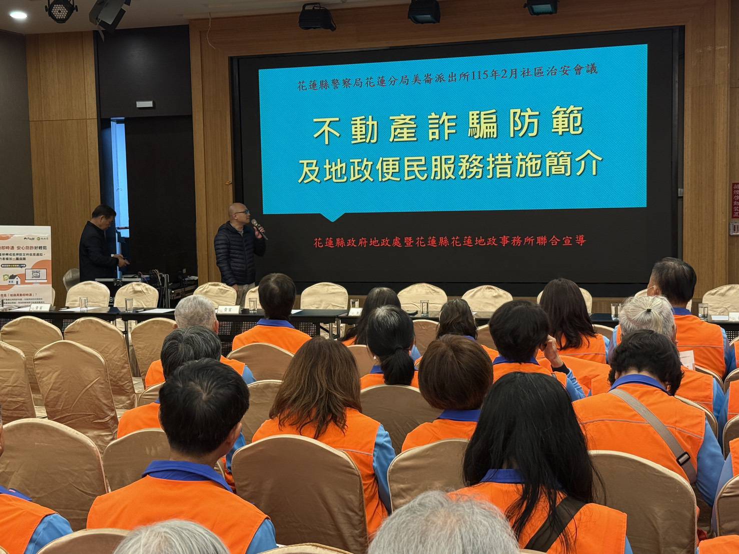 會議過程中由衛生局毒品危害防制中心及花蓮縣花蓮市地政事務所進行毒品與反詐騙宣導;另由花蓮分局偵查隊長謝宗基進行預防犯罪宣導,解說民眾可能遭遇的各類詐騙態樣,鼓勵社區居民主動參與反詐行動,強化「識詐」觀念,以擴大反詐宣導量能;在交通安全宣導方面,則由花蓮分局第五組組長許銘浚報告防制A1、A2交通事故的具體作為,並針對交通安全觀念及電動慢車相關規定進行說明,期盼透過持續宣導,深化民眾交通安全教育,有效防制交通事故發生。