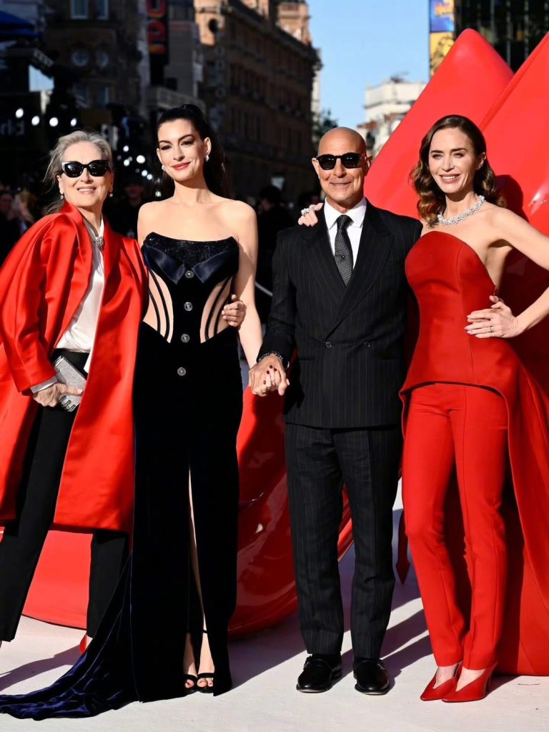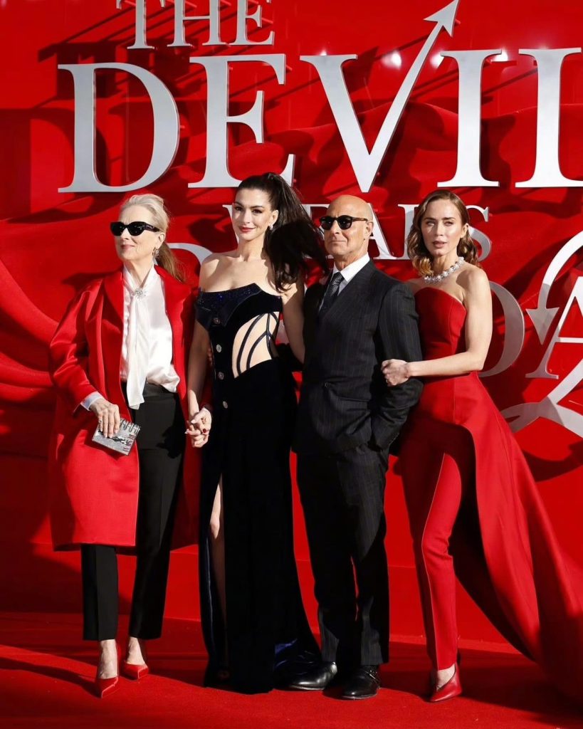 Emily Blunt 以 Balenciaga 定制禮服驚艷登場,大膽的建築感剪裁結合紅色長褲與拖地長尾,配以 Mikimoto 項鏈,展現出極具力量感的華麗氣場。唯一的男主角 Stanley Tucci 穿著 Paul Smith 條紋西裝,展現不凡的紳士魅力。這場跨越時空的時尚盛宴,證明了經典傳奇依然魅力不減。