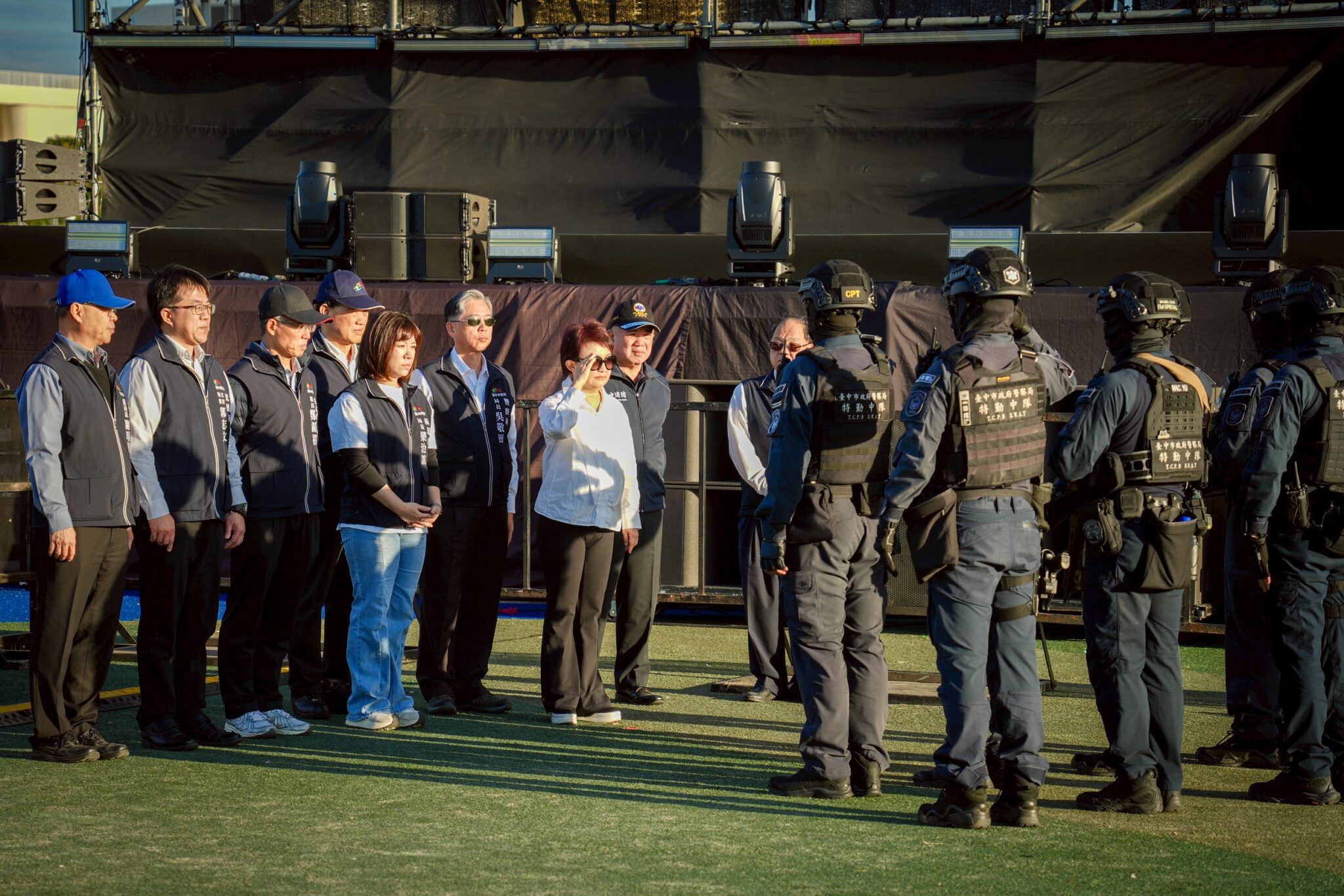 盧市長也向現場警消同仁精神喊話,強調台中為全國第二大城市,近期大型活動密集,維安任務相對繁重,感謝第一線人員的辛勞與付出。她說,市府自北捷事件後即啟動第一階段維安控管,並針對跨年及後續多場大型活動持續檢討與強化部署。她對各系統團隊非常有信心,期勉大家齊心完成任務,讓所有市民都能平安、安心迎新年,也提醒同仁務必照顧自身健康,城市安全有賴大家共同守護。
