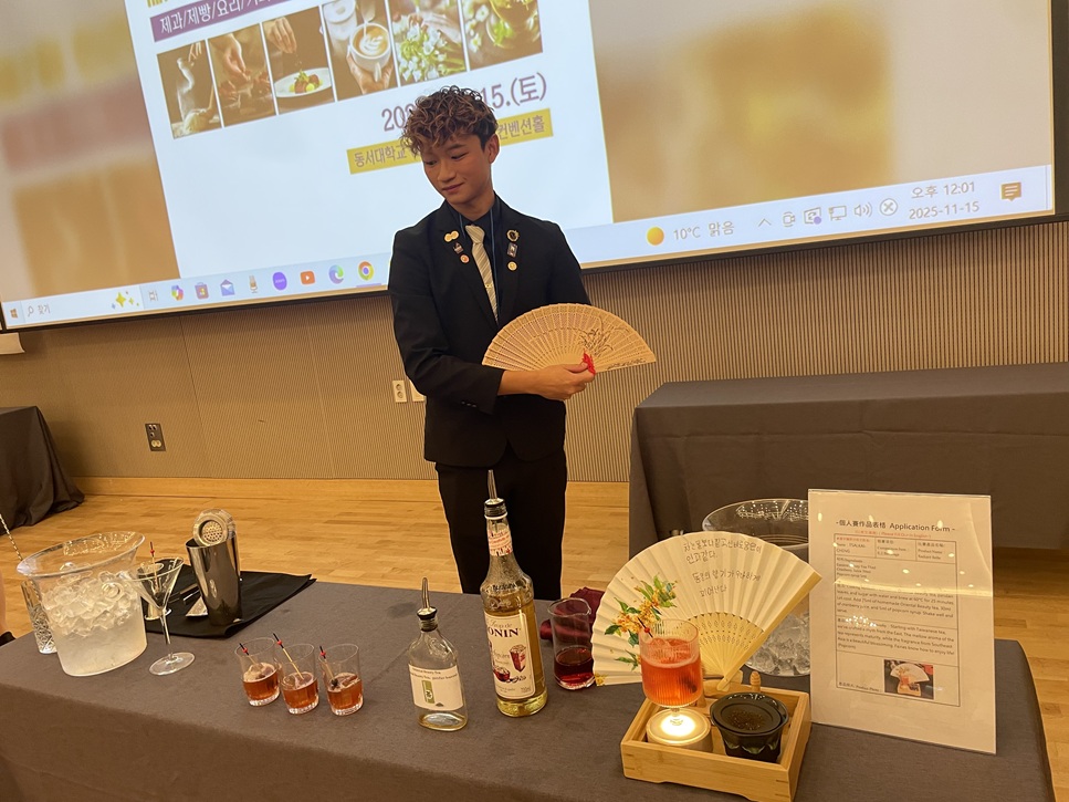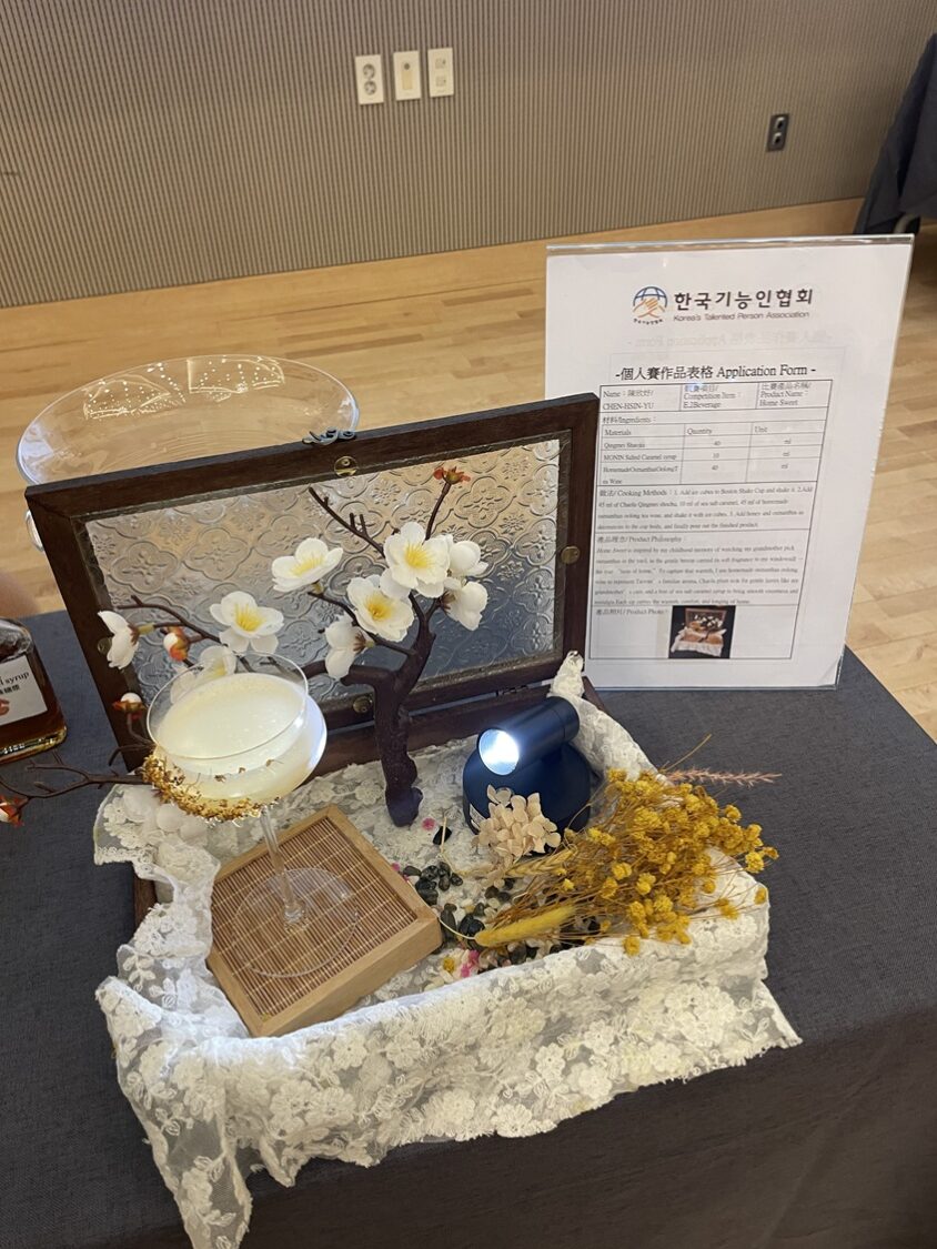 面對眾多國際好手,休觀系學生表現亮眼。蔡凱丞、陳欣妤與李畇蓁三位同學在動態傳統調酒組分別以《Ghost》、《Flare》與《Breeze of Early Summer》奪下金牌。三人皆以韓國在地特色燒酒為基底,融合個人風格與跨文化美學,深獲評審青睞。