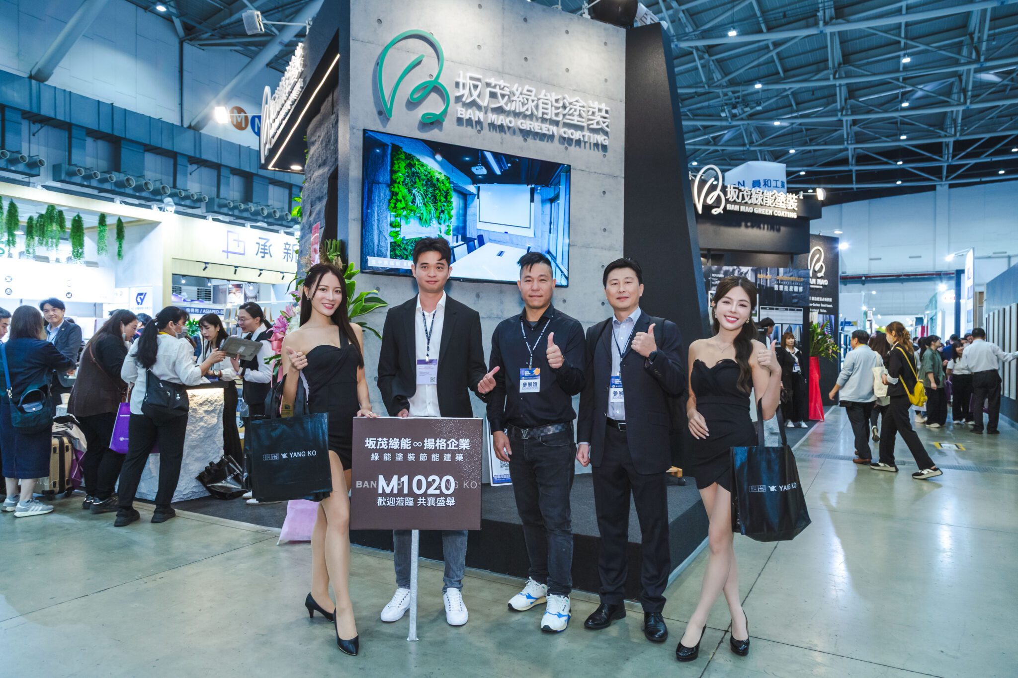 圖:坂茂綠能工程總經理羅志岡(左三)、長興材料合成樹脂事業部全球行銷長李聖忠(右二),率展示團隊於台北國際建材展「坂茂綠能塗裝」展位展出,成為展場綠建材熱門焦點。圖/業者提供
