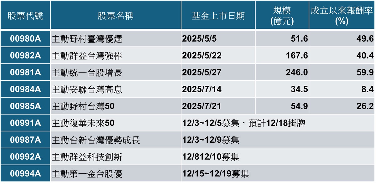 台灣主動式ETF市場在2025年迎來爆炸性成長。自5月首波產品上市以來,台股主動式ETF已在半年內吸引 554.5億元規模,穩居今年ETF類型之冠,並堪稱今年台股資產配置最大亮點,如今年底前更有復華未來50(00991A)等4檔ETF陸續展開募集,並成為年底最受關注的台股焦點之一。