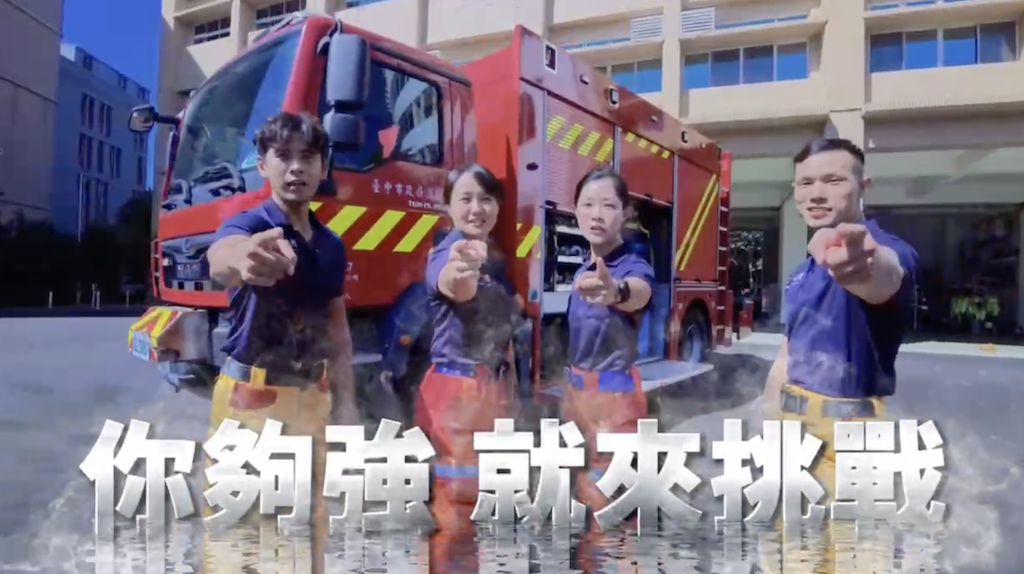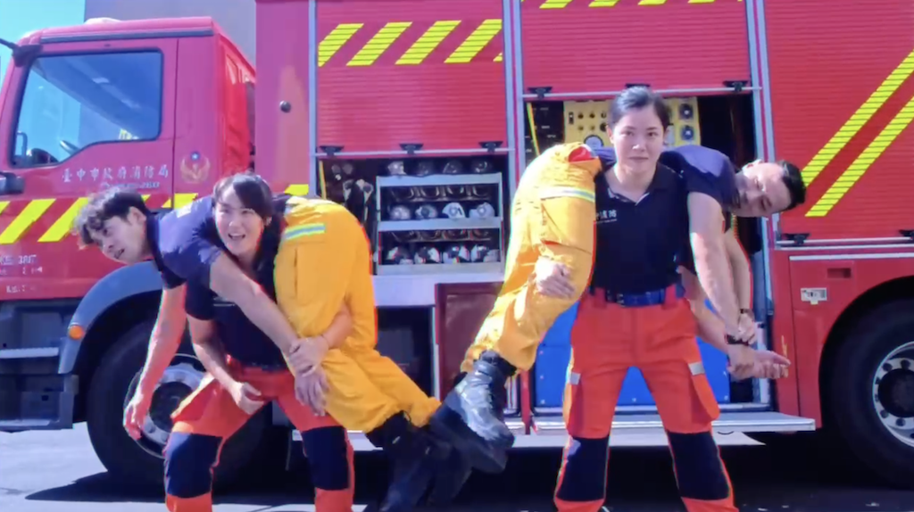 同一時間臺中市政府消防局也在臉書發布一則影片,用幽默趣味的形式展現同仁透過堅實訓練造就的強健體魄,以因應在火場救難的各種狀況。影片中扛起男同事的四平分隊楊敏加分享當時情況:「拍攝前夥伴突發奇想,問我們女孩子能否扛起80公斤的男生,這對經常要搬運傷患的我們來說問題不大,想不到因此創造出這個效(笑)果。」另一位參與演出的烏日分隊李熙軍強調:「沒有運動習慣的人一但進入火場,在能見度不足下常會表現緊張、喘不過氣連爬樓梯都難,透過訓練能幫助消防員在耐力、肌力的提升,甚至對心理素質也加強不少。」