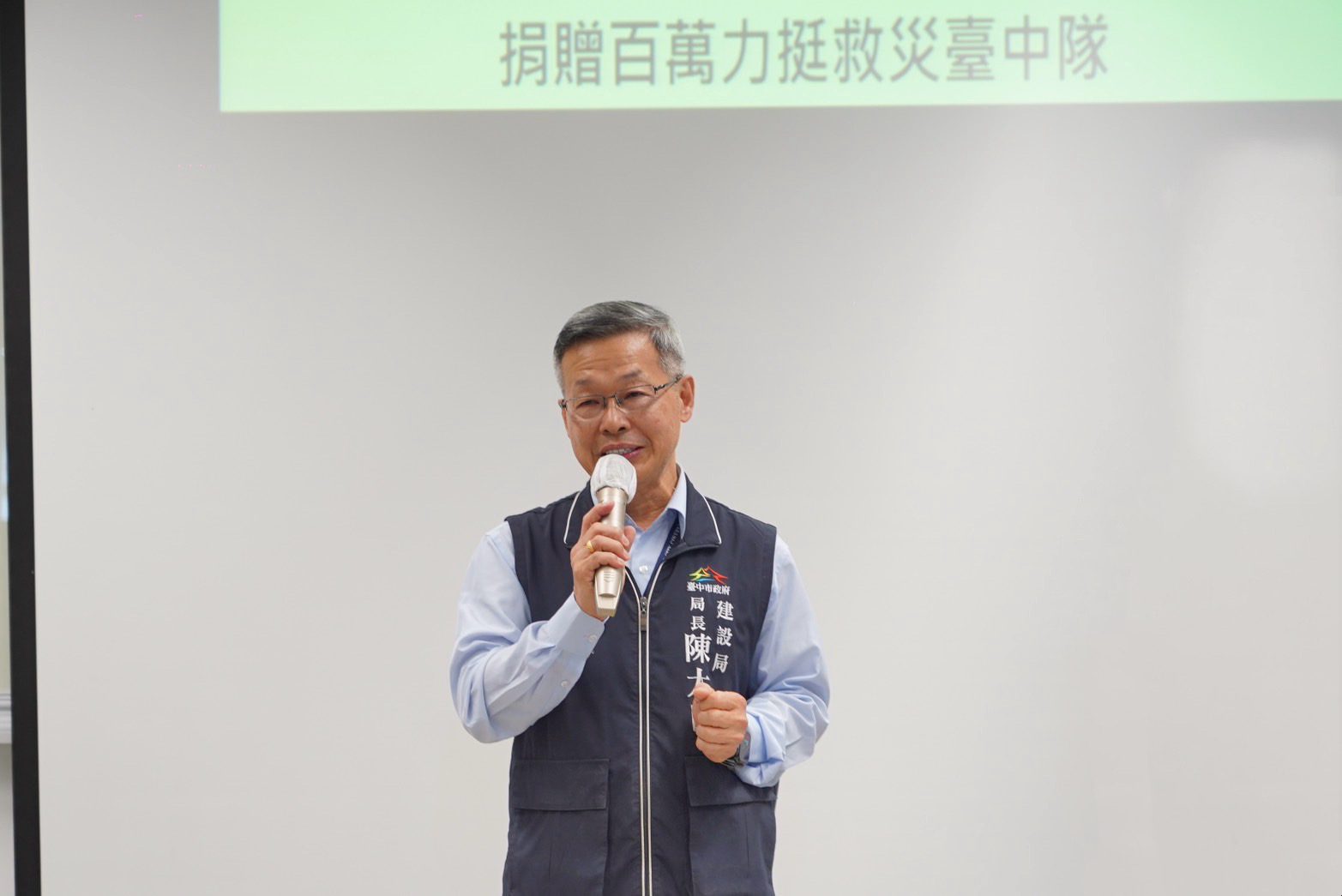 由台中市政府建設局組成的「救災台中隊」日前順利完成花蓮光復鄉及宜蘭蘇澳的兩階段救災任務,第一時間投入災後清淤與環境復原,不僅展現專業戰力,更在災區傳遞台中「人飢己飢、人溺己溺」的溫暖力量。市長盧秀燕對所有參與救援的同仁與協力企業表達深深感謝,強調面對天災,跨城市合作與即時支援格外重要。在昨(2)日的擴大局務會議中,建設局長陳大田代表盧市長特別表揚12家協力廠商,感謝他們日夜奮戰、協助清淤重建;同時,台中市不動產建築開發商業同業公會由理事長謝麟兒代表捐贈100萬元,協助添購救災物資、機具及安全防護用品,共同強化建設局防救災量能,體現跨界攜手、齊心度過難關的堅韌精神。