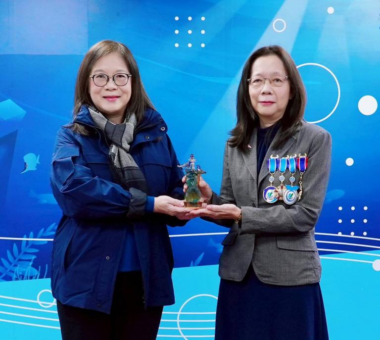 ▲海委會副主委黃向文卸任,海委會主委管碧玲頒授最高榮譽海洋專業獎章。(圖/海委會提供)