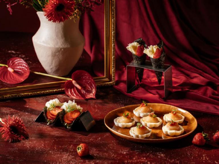 潮韻】以草莓風味巴薩米克醋膏搭松葉蟹的開場前奏,到【鮨影】草莓干貝莎莎最中餅與拉斯帕起司莓映壽司的和風交融;【綠宴】的兵庫螢烏賊草莓沙拉與起司雪花草莓可頌,酥脆可頌夾入輕盈如雪起司與新鮮草莓,展現冬季法式自然。【炙曦】的爐烤香草豬肋排佐草莓多蜜醬、炙烤乳酪草莓干邑松阪豬;再到【炙境】的草莓松露火腿牛肝菌麻花捲麵與莓果陳酒韓式炸雞,【酌光】草莓栗香蒙布朗與草莓晨露銀耳、【瑰彩】草莓花園法式塔、草莓雲朵奶酪、草莓玫瑰旅人蛋糕、草莓生乳捲及草莓大福等七款草莓甜點,場場皆驚艷,款款皆打卡焦點。