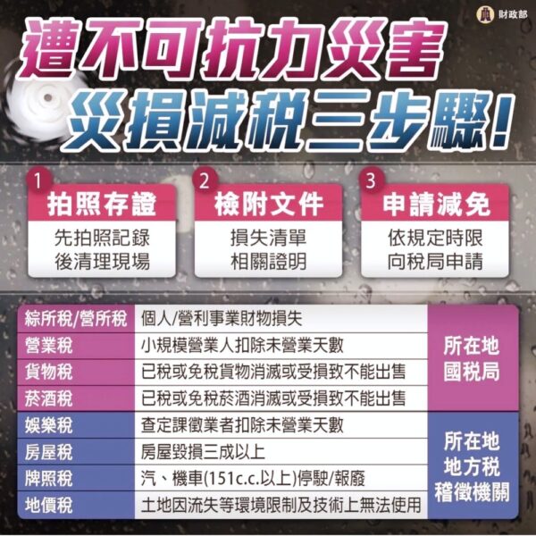 ▲災害捐失申請稅捐減免三步驟。(圖/竹北國稅局提供) 【焦點時報/記者羅蔚舟報導】114年12月27日強震對部分地區造成災害,財政部北區國稅局竹北分局提醒受災民眾,記得先拍照留下事證,於災害發生後30日內檢具損失清單及證明文件,報請該管稽徵機關派員勘查,以維護自身權益,並請民眾注意自身安全。 ▲災害捐失申請稅捐減免三步驟。(圖/竹北國稅局提供) 北區國稅局竹北分局特別就與民眾關係較為密切之所得稅、營業稅、貨物稅、菸酒稅等稅目之減免規定,提醒納稅義務人應依下列規定辦理:一、所得稅:(一) 個人受災金額在新臺幣30萬元以下、營利事業受災金額在500萬元以下或受損標的投有保險者(不論金額多寡),可免報國稅局派員勘驗,直接於上述規定期限內申報受災相關資料或證明,供當地稅捐稽徵機關書面審核,憑以核發災害損失證明。(二) 納稅義務人遭受不可抗力之災害損失,於扣除保險賠償及救濟金後之金額,可憑稽徵機關勘驗後出具之損失證明,於申報綜合所得稅時申報列舉扣除,或申報營利事業所得稅時列報災害損失費用,即可減免稅捐。 二、營業稅:小規模營業人凡因災害影響無法營業者,可向所在地國稅局分局或稽徵所申請,准予扣除其未營業之天數,以實際營業天數查定營業稅。 三、貨物稅:受災之貨物稅廠商,其已稅貨物如消滅致不能出售者,應檢具證明文件,依貨物稅條例第4條及貨物稅稽徵規則第87條規定辦理退稅。 四、菸酒稅:受災之菸酒稅廠商,其已納菸酒稅之菸酒如消滅致不能出售者,得依菸酒稅法第6條及菸酒稅稽徵規則第39條規定於災害發生後30日內,檢具損失清單及相關證明文件向管轄國稅局報備,俾據以向管轄國稅局或海關辦理退還菸酒稅及菸品健康福利捐或銷案。 北區國稅局竹北分局進一步說明,納稅義務人辦理申報災害損失,可至財政部北區國稅局網站(網址: https://www.ntbna.gov.tw/#gsc.tab=0 )建置之「災害損失減免專區」下載申請書表,該專區並提供線上申辦災害損失,請有需要民眾多加運用。以上訊息若有任何疑問,可撥打免費服務電話0800-000321洽詢,將有專人為您詳細解說。