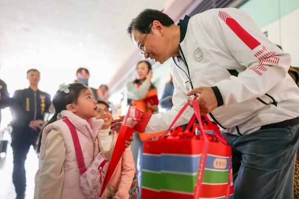 今日適逢西洋情人節,張市長特別準備象徵甜蜜祝福的巧克力花束,發送高鐵桃園站的返鄉旅客,為春節旅程增添溫馨氣氛,並祝福市民朋友新的一年平安順遂、闔家幸福。