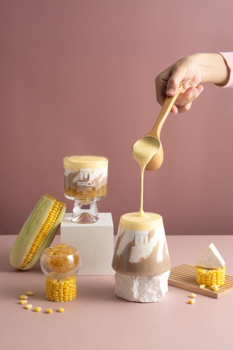 【金絨芋泥系列】在風味設計上,並不追求甜度堆疊,而是回到食材本身,強調天然香氣與口感層次,玉米皆為門市現磨玉米汁,保留「金甜、清亮、自然香」三種最動人的玉蜀黍特質,入口時能感受到清香先行、甜味後至的層次變化;芋泥則選用大甲芋頭、能品嘗到微妙的芋頭顆粒感與類芋簽的軟嫩纖維感,使其溫和、醇厚、不搶玉米主味,卻能形成巧妙的口感體驗;而本次最具創意的亮點,則是麻古獨家首創的「玉米圓」!採包心工法製作,外層Q彈、內裏保留玉米碎顆粒,咬下時能感受到與一般粉圓截然不同的香氣與層次,也是本次新品在市場上最具識別度與創新性的風味亮點,呈現平衡、飽滿卻不膩口的飲中甜品新體驗。